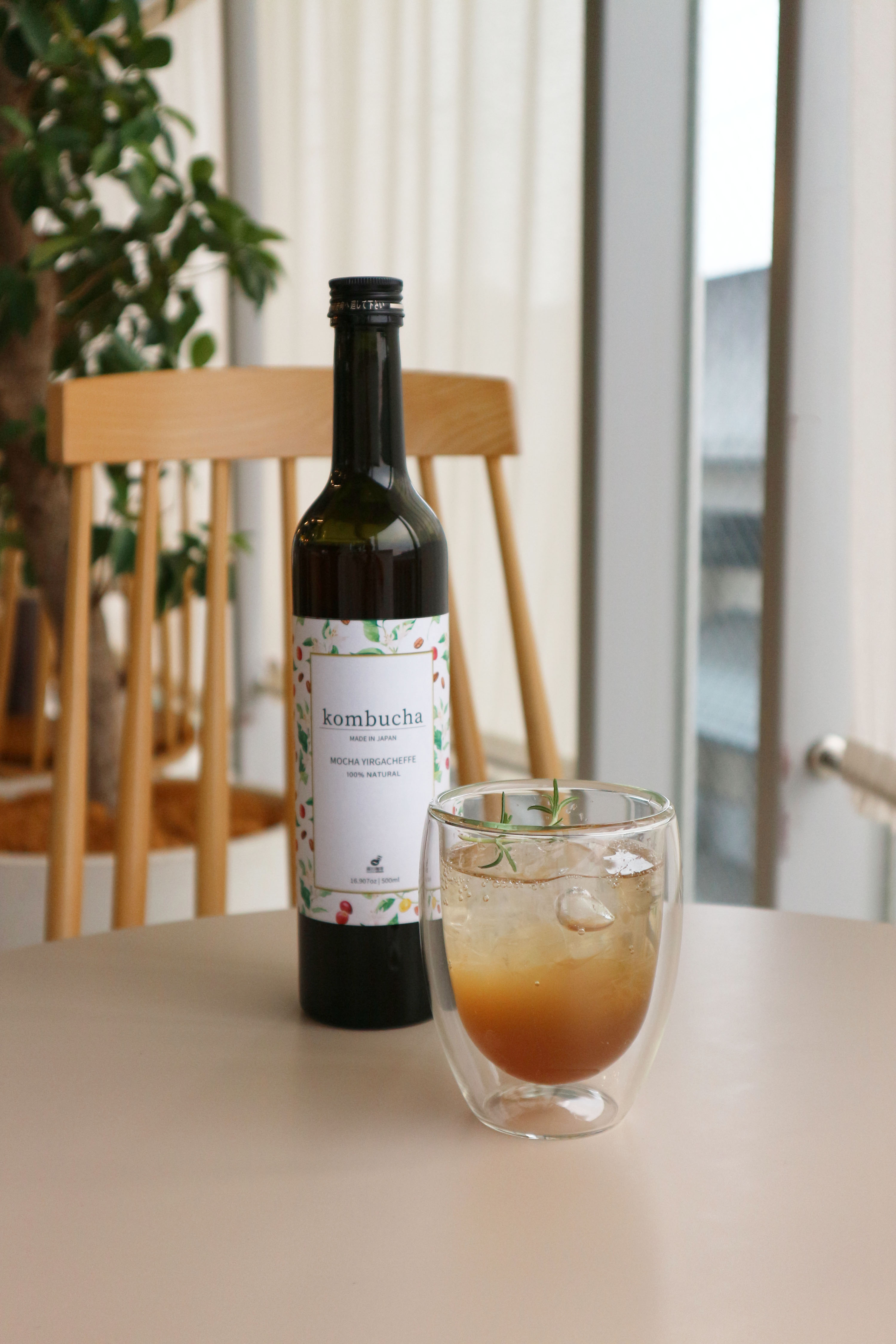 コーヒーの薄皮シルバースキン(チャフ)を紅茶や緑茶とブレンドしたものに、ミネラル豊富なさとうきび糖を加えて酢酸菌と酵母で発酵させ、更にコーヒー豆を浸漬させて香り付けをしたコーヒーフレーバーのコンブチャです。